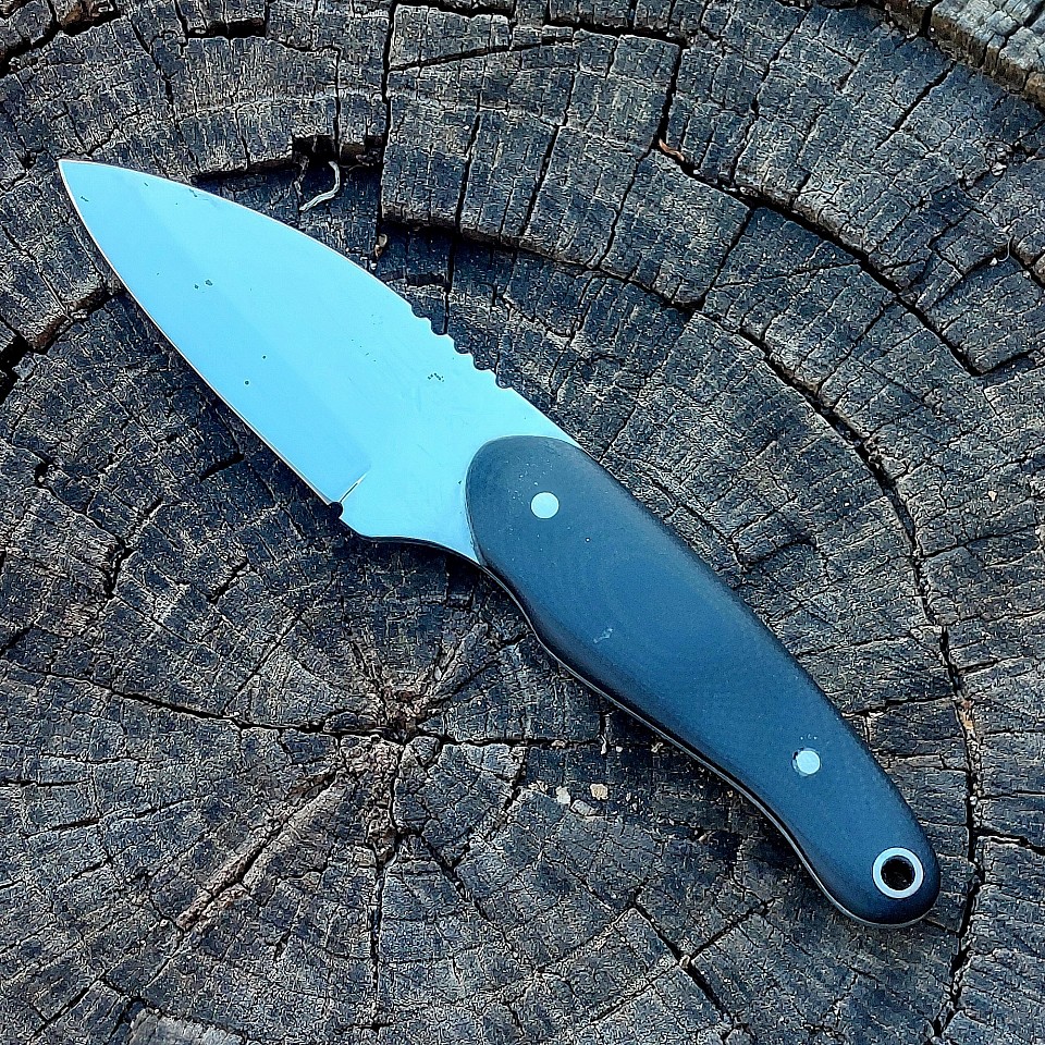 Knife 47 - drop point with a 5 1/2" polished 1095 steel blade. The black canvas micarta scales measure 4 1/2" long. The knife features jimping on the spine, stainless steel pins, and a stainless steel lanyard hole. A kydex sheath with teklok spacing is included. $150.00 + $10.00 shipping and handling