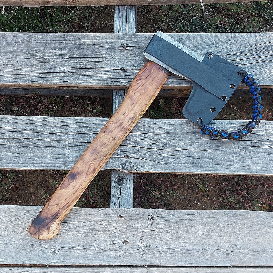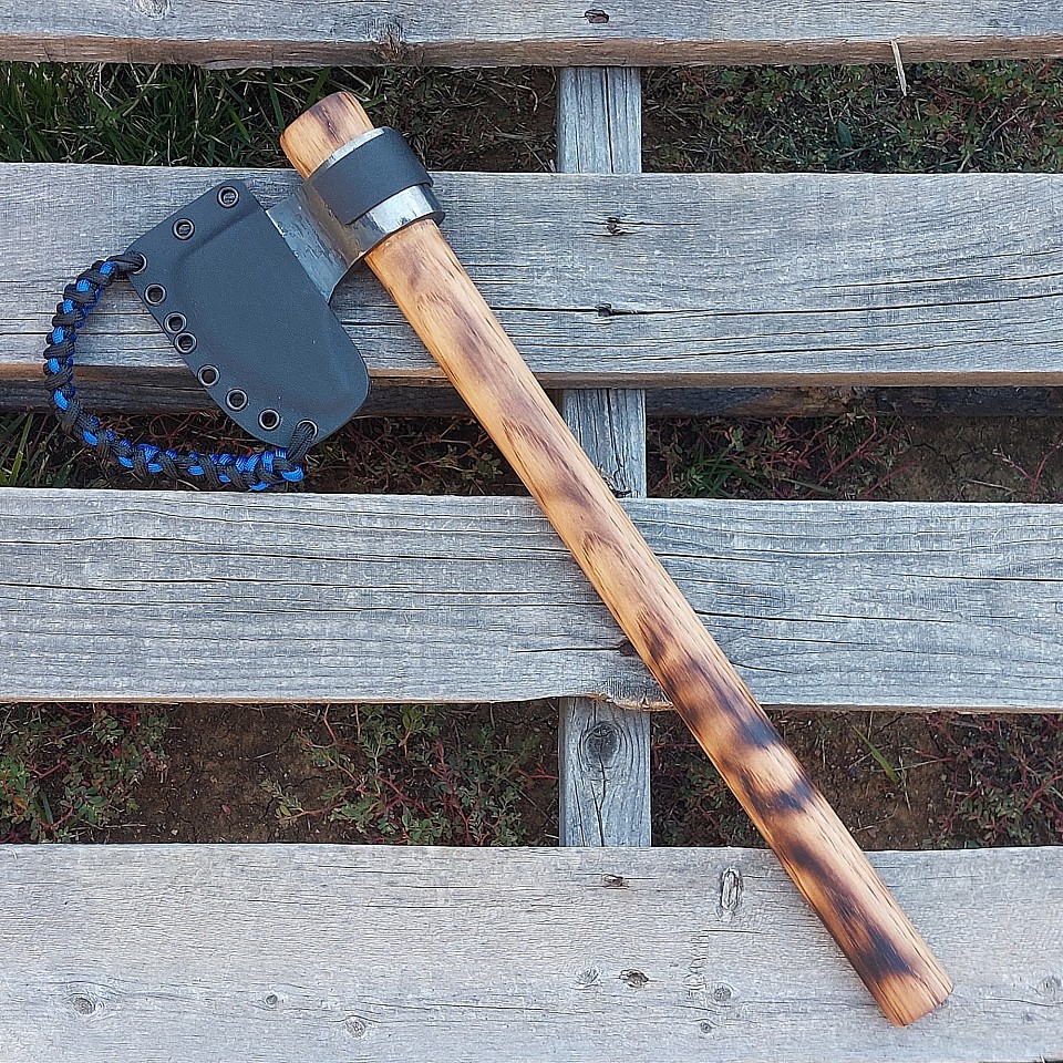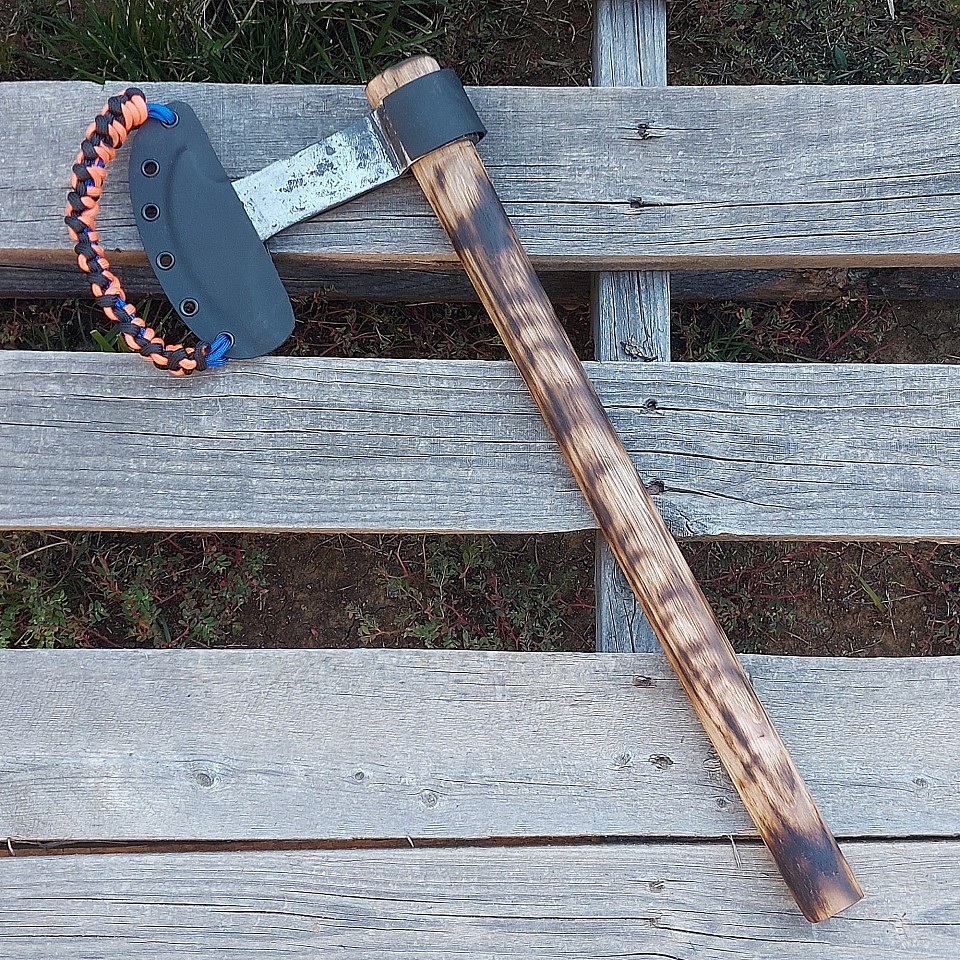 Axe 1 - this tool features a wrapped head that is hand forged out of 5160 steel and has a 3 1/2" W2 bit. The burnt hickory handle measures 15 1/2" long. A black kydex sheath is included. $110.00 + $15.00 shipping and handling