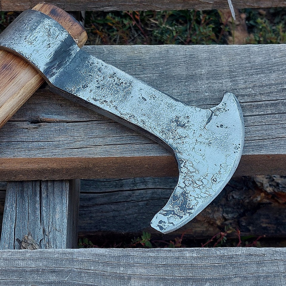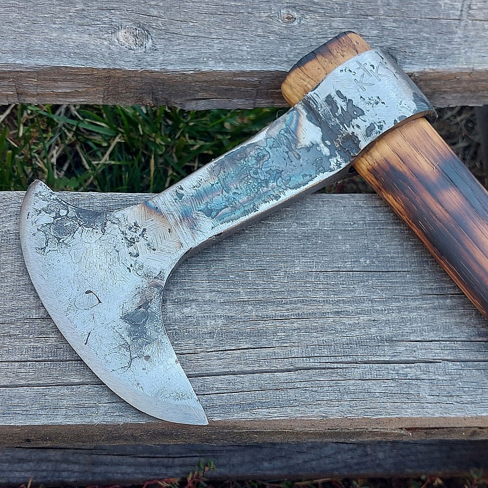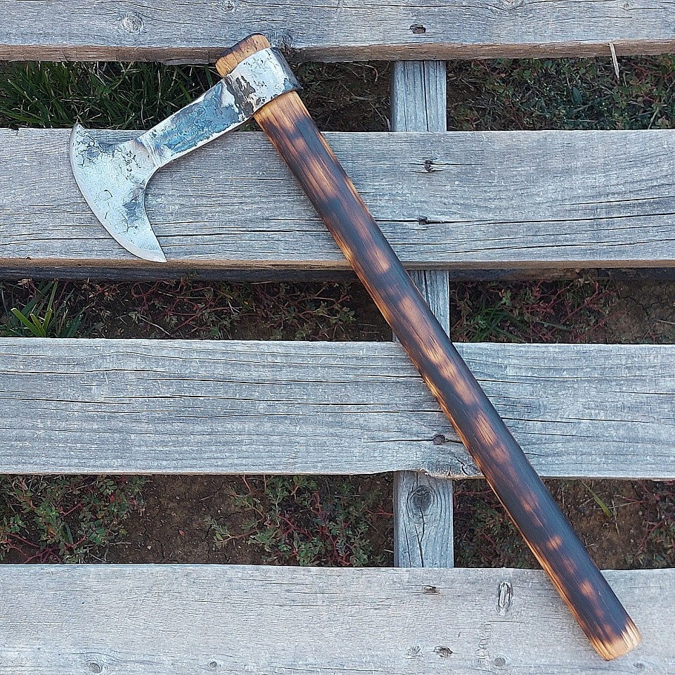 Axe 3 - the axe head was forged out of tool steel and the 4 1/2" bit was forged from a king pin that was used in a F550 tow truck. The burnt hickory handle is 17" long. A kydex sheath is included. $110.00 + $15.00 shipping and handling