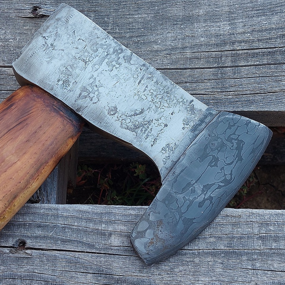 Axe 4 - this hatchet features a hand forged ball bearing damascus bit measuring 4" long in a 5160 steel head. The hickory handle is 13 1/2" long. A kydex sheath is included. $150.00 + $15.00 shipping and handling