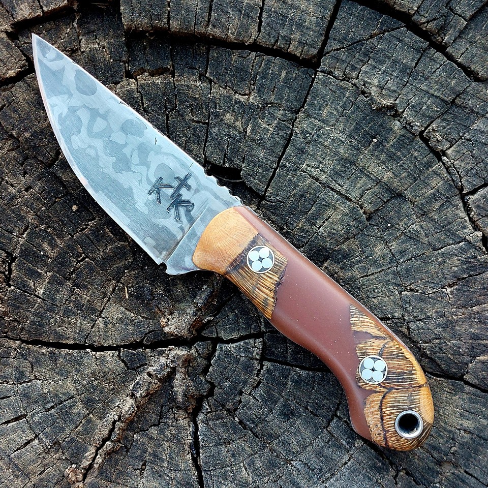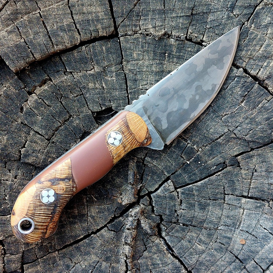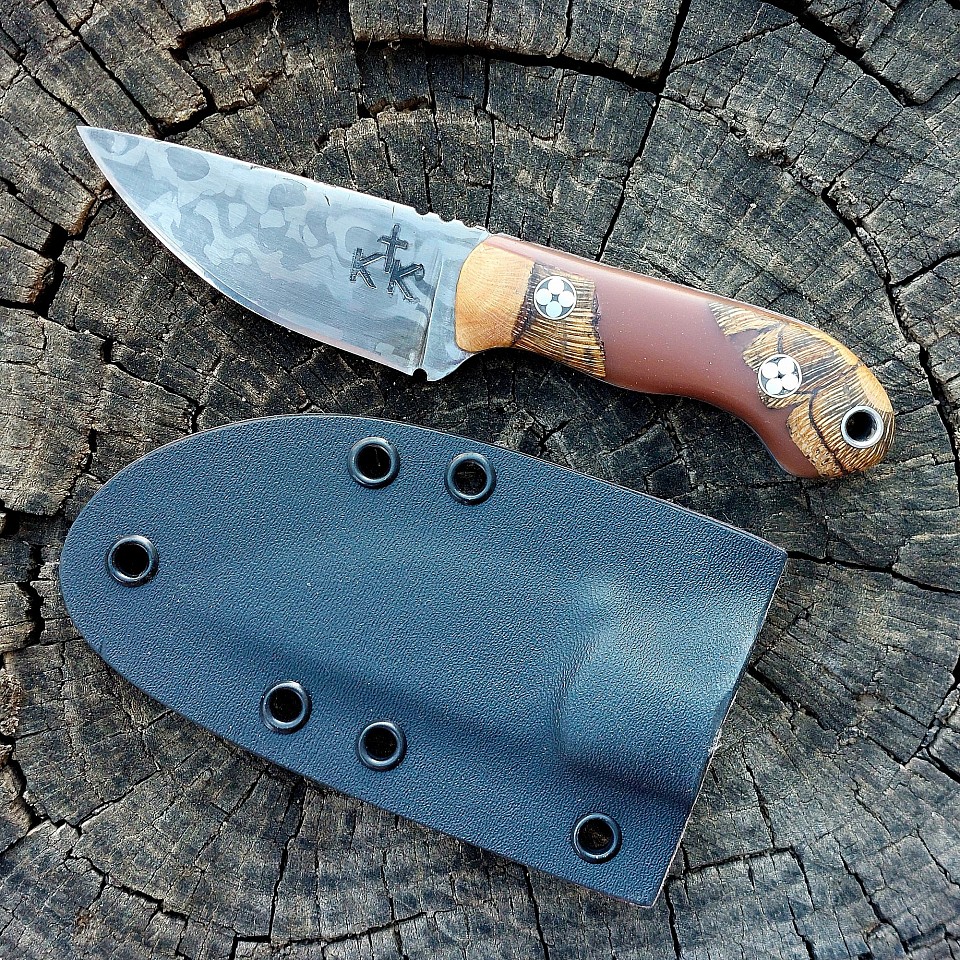Knife 146 - drop point with a 4 1/2" 3,610 layered (1095 & 15N20) damascus blade. The brown acrylic scales with stabilized driftwood from the shore of Lake Erie measures 4 1/2" long. The knife features jimping on the spine, mosaic pins, and a stainless steel lanyard hole. A leather lined kydex sheath with teklok spacing is included. $625.00 + $10.00 shipping and handling