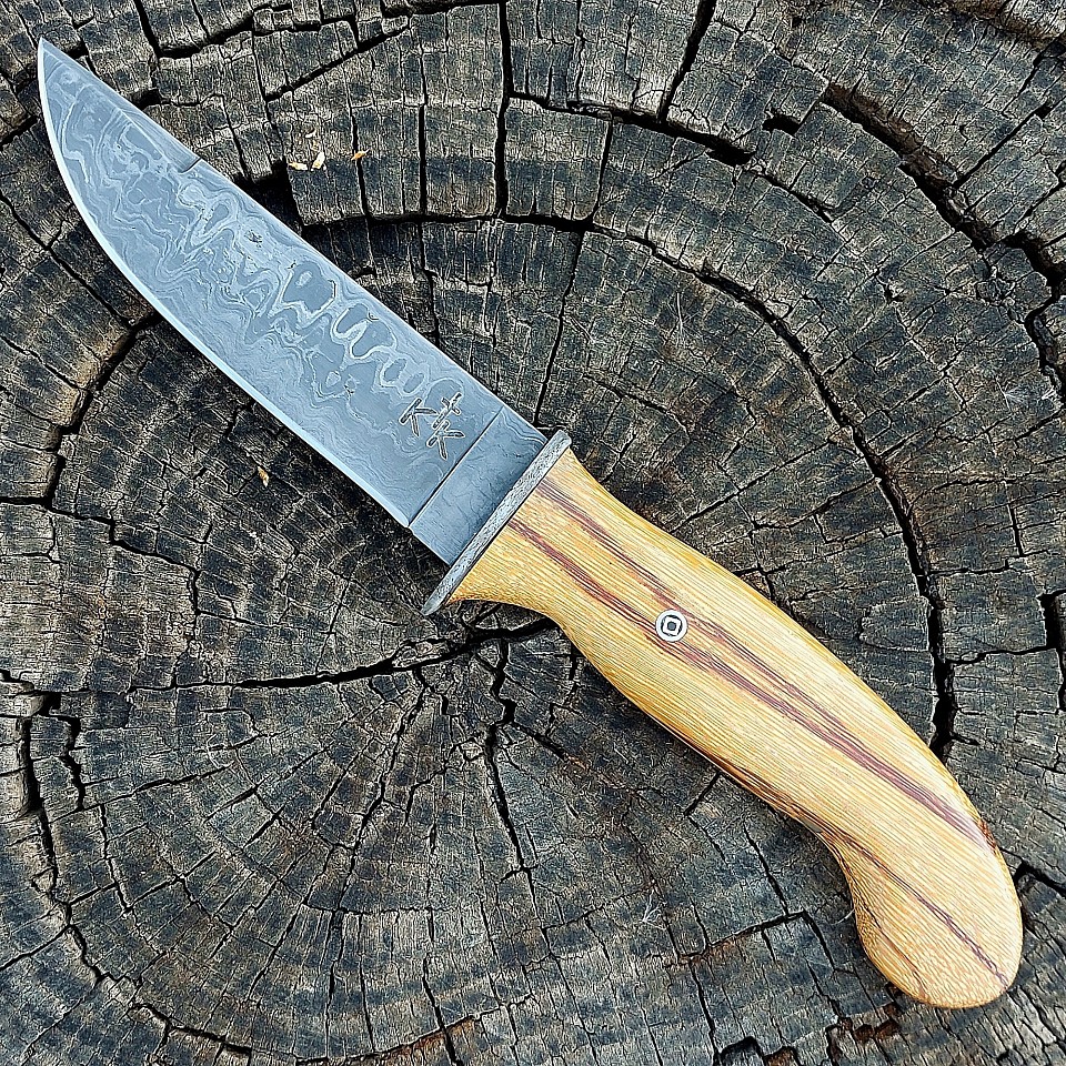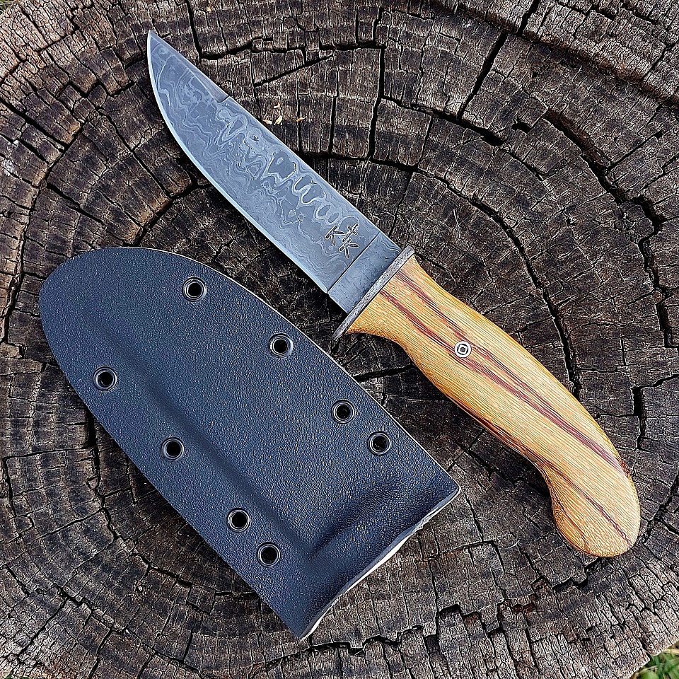 Knife 183 - straight back 206 layer (1084/15N20) ladder pattern damascus blade measuring 5" long. The zebra wood handle measures 4 1/2" long. The knife features a damascus guard and a mosaic pin. The leather lined kydex sheath is included and is set up for vertical or horizontal carry. $300.00 +$10.00 shipping and handling.