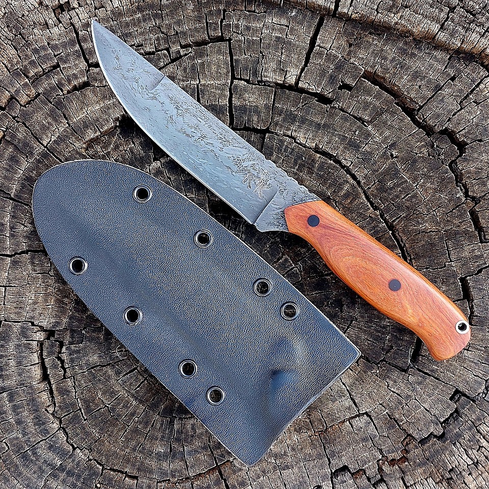 Knife 184 - straight back with a 5 1/4" twisted cable damascus blade with false edge. The Pau Rosa wood handle measures 4 1/2" long. The knife features jimping on the spin, black carbon fiber pins, and a stainless steel lanyard hole. The leather lined kydex sheath is included and is set up for vertical or horizontal carry. $325.00 + $10.00 shipping and handling.