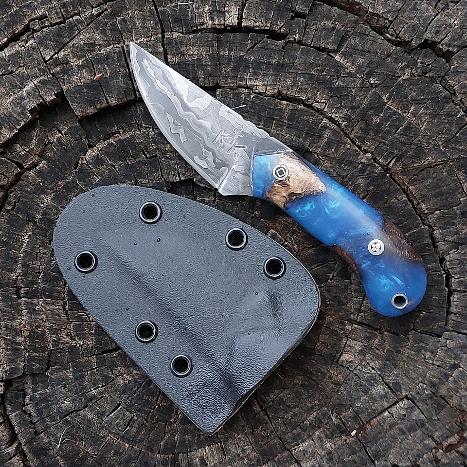 Knife 188 - straight back with a 2 1/2" Colorado Chainsaw damascus blade. The handle is made from blue acrylic and stabilized driftwood. The knife features jimping on the spine and mosaic pins. The leather lined kydex sheath is included and is set up for vertical and horizontal carry. $300.00 + $10.00 shipping and handling