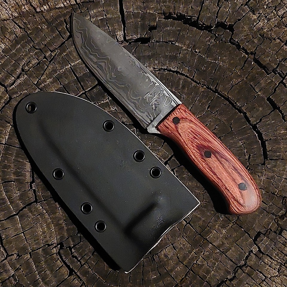 Knife 201 - I would be proud to put this drop point in my personal collection! The blade is made from 5 3/8" of 1/4"" ball bearings and 1084 w/4% nickel powder canister damascus. The handle is made from Cherrywood dymalux. The knife features stainless steel pins and lanyard hole. A leather lined kydex sheath is included and is set up for vertical and horizontal carry. $425.00 + $10.00 shipping and handling