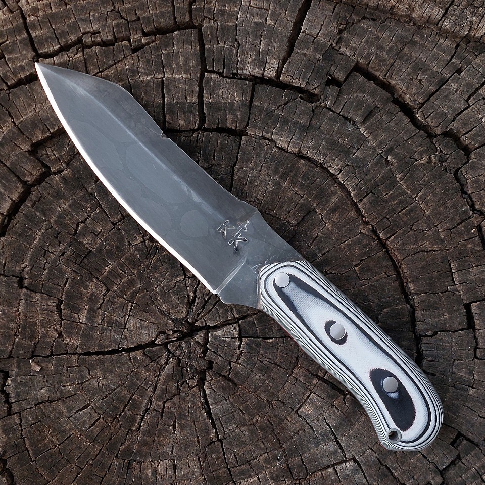 Knife 200 - drop point with a absolutely stunning 5 1/2" 340 layer 26C3 - 1084 - 15N20 - pure nickel blade. The scales are made from Ebony. The knife features mosaic pins and lanyard hole. A leather lined kydex sheath is included and is set up for vertical or horizontal carry. $525.00 + $10.00 shipping and handling