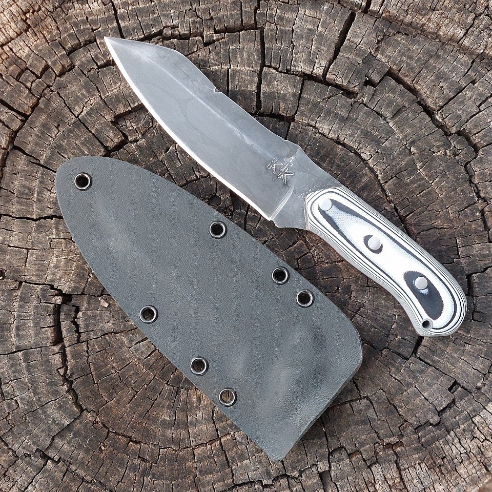 Knife 194 - drop point with a 5" ball bearing canister damascus blade with a full false edge on the spine. The handle scales are white and black micarta. The knife features stainless steel pins and lanyard hole. A leather lined sheath is included and is set up for vertical and horizontal carry. $225.00 + $10.00 shipping and handling.