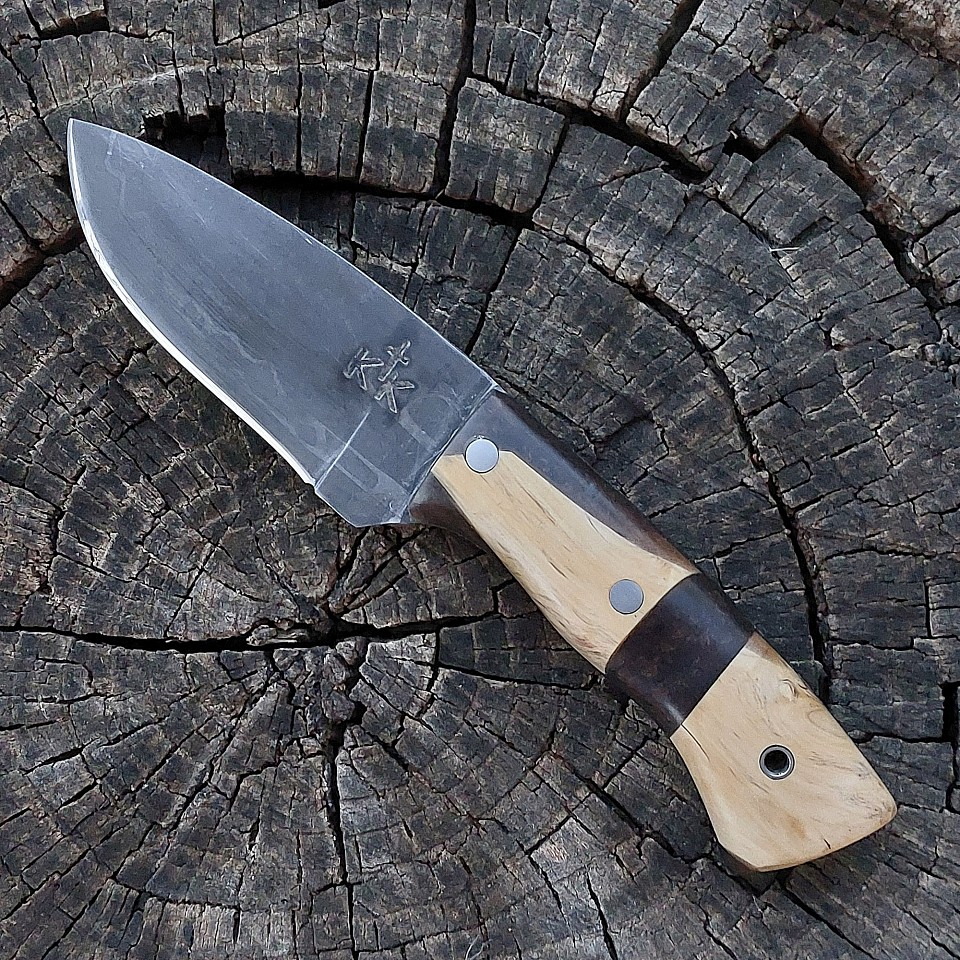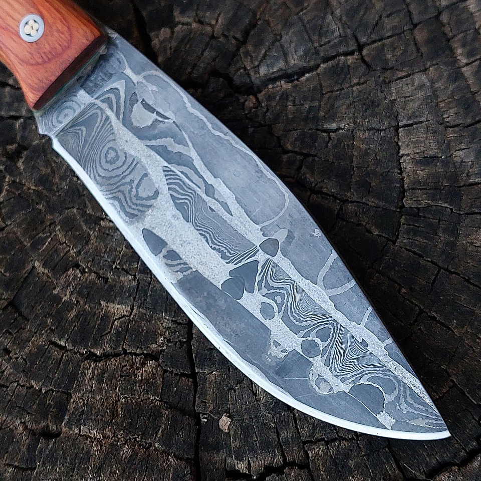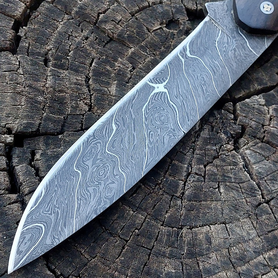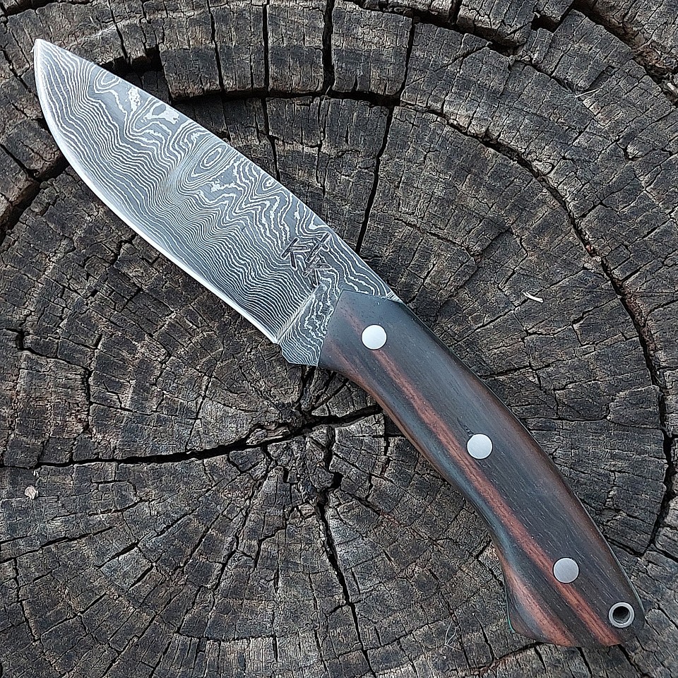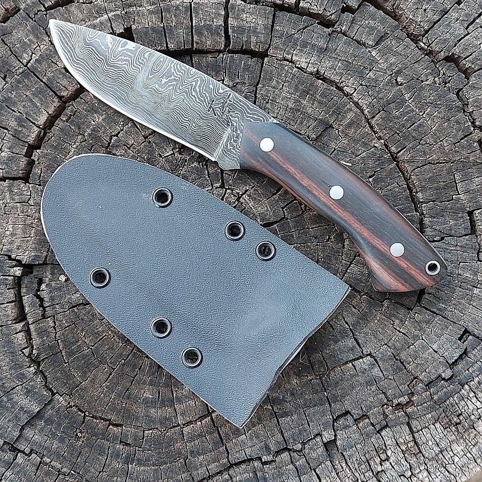 Knife 199 - this drop point is one of the prettiest knives that we've made to date! The blade is 4" of 400 layer 15N20 and 1095 steel. The handle is made from Macassa Ebony. The knife features stainless steel pins and lanyard hole. A leather lined kydex sheath is included and is set up for vertical or horizontal carry. $425.00 + $10.00 shipping and handling