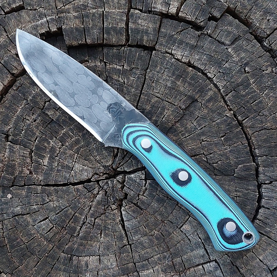 Knife 197 - drop point with a 3 3/4" 1/4" ball bearing and 1084 powdered steel canister damascus blade. The handle scales are made out of blue and black G-10. The knife features stainless steel pins and lanyard hole. A leather lined kydex sheath is included and is set up for vertical and horizontal carry. $275.00 + $10.00 shipping and handling