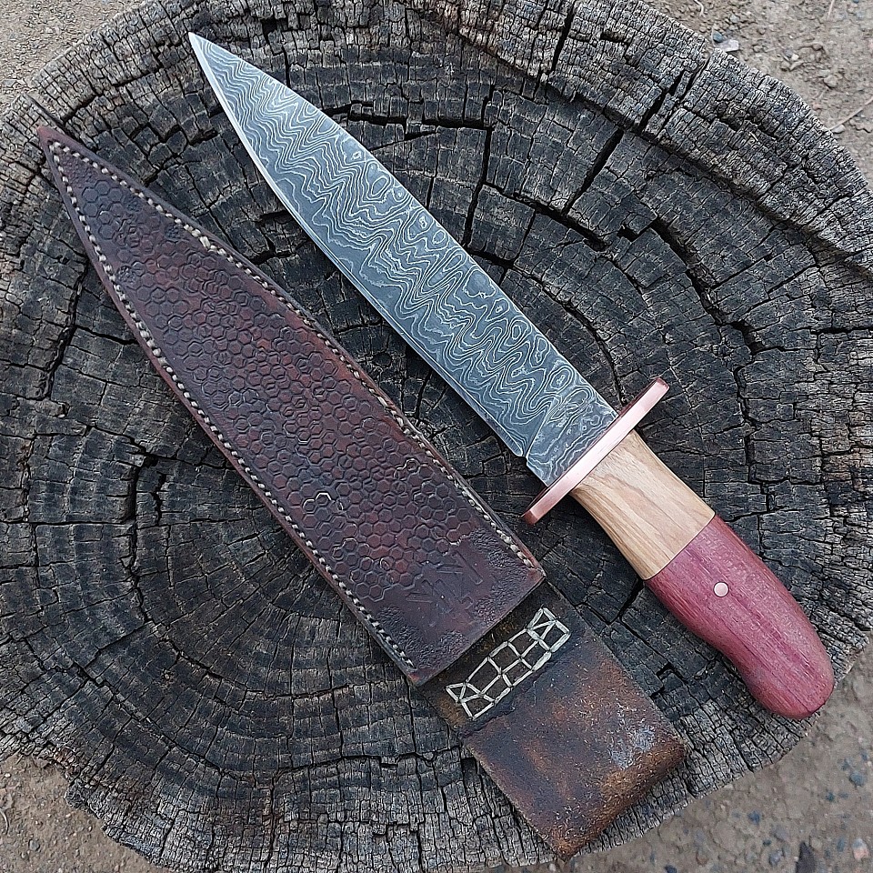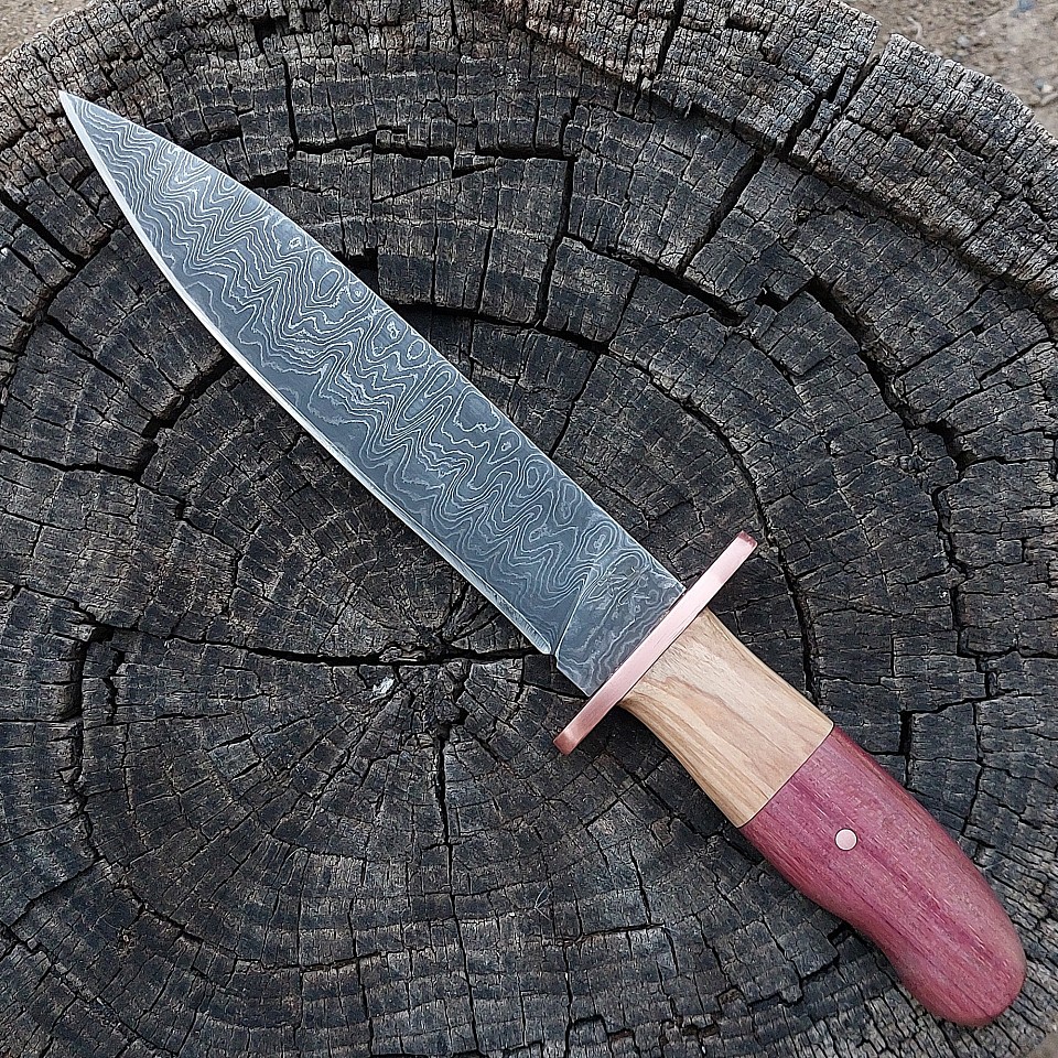 Knife 203 - Arkansas toothpick with a 7 3/4" 400+ layers of 52100 - 5160 - 15N20 - pure nickel and copper. The handle is made from Purpleheart and Olive wood. The knife features a copper guard and copper pin. A leather sheath is included. $525.00 + $15.00 shipping and handling