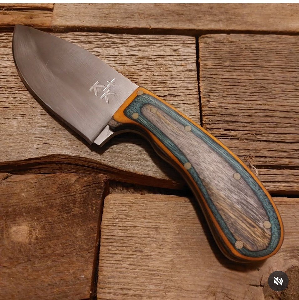 Knife 117 - drop point EDU with a 2 3/4" 80CRV2 steel blade. The maple richlite scales with blue liners measure 3 3/4" long. The knife features jimping on the spine, black G10 pins, and a stainless steel lanyard hole. This is our version of the Buck Mini Alpha Hunter. A kydex sheath with teklok spacing is included. $160.00 + $10.00 shipping and handling
