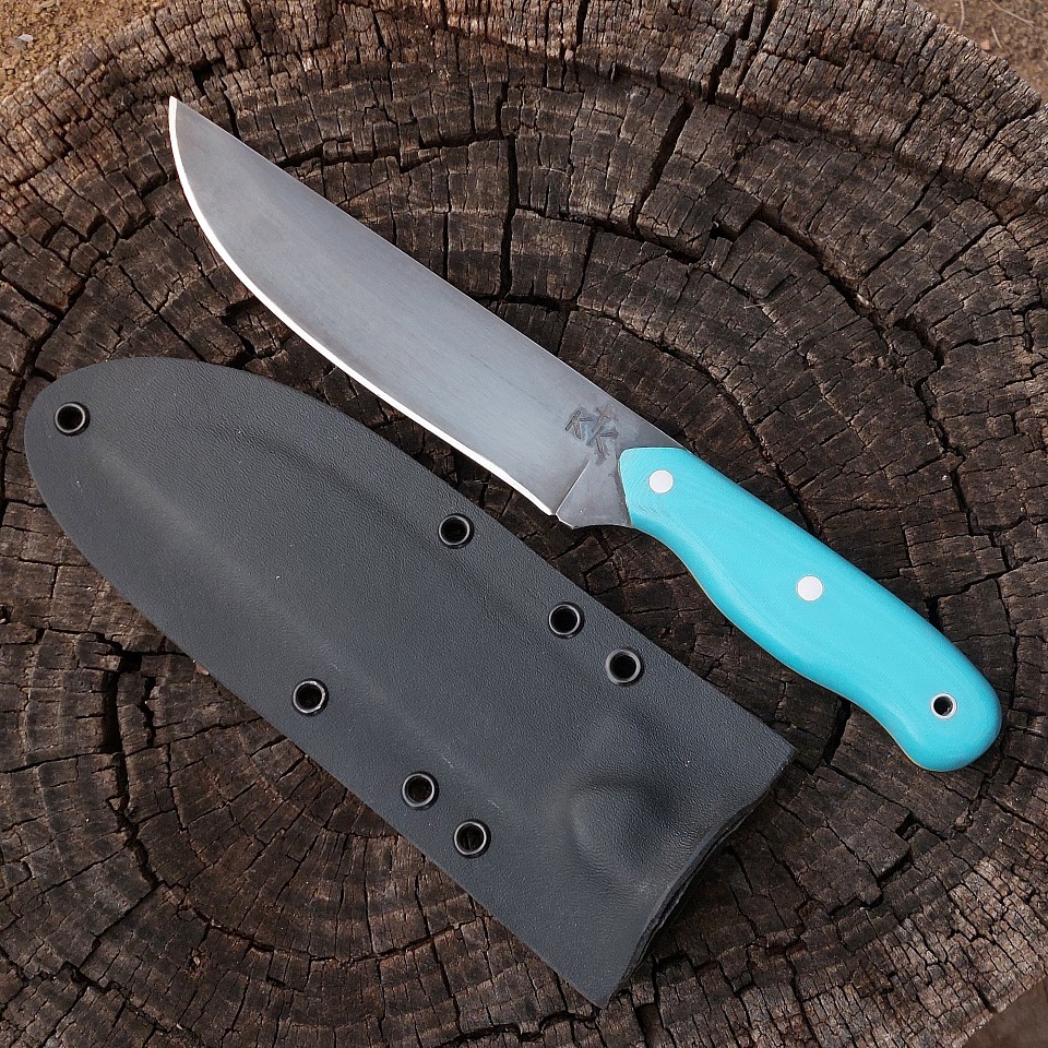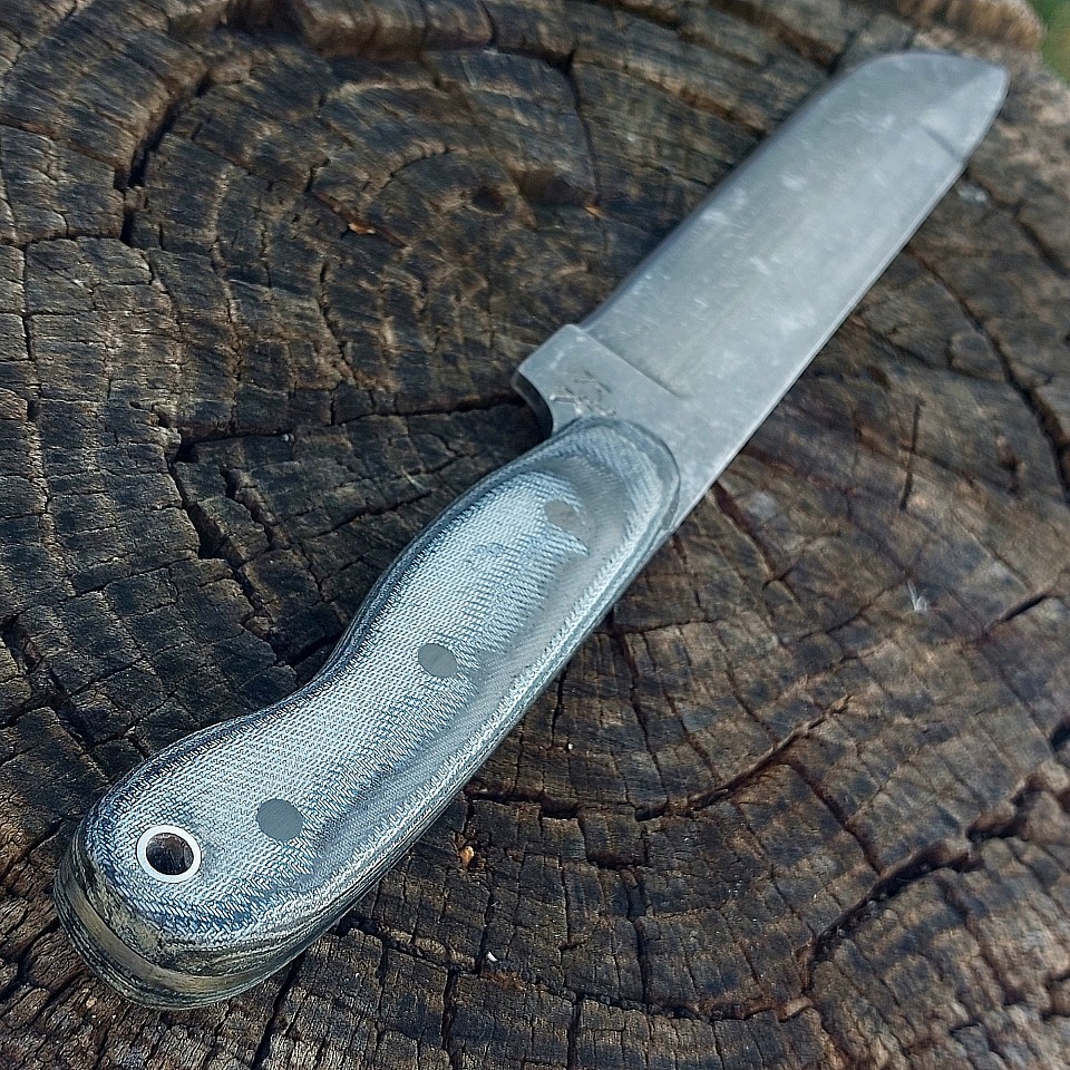 Knife 186 - straight back with a 8" acid etched and stone washed 80CRV2 steel blade. The Wrangler denim micarta handle measures 5" long. The knife features a false edge, carbon fiber pins, and a stainless steel lanyard hole. The kydex sheath is included and is set up for vertical and horizontal carry. $225.00 + $15.00 shipping and handling